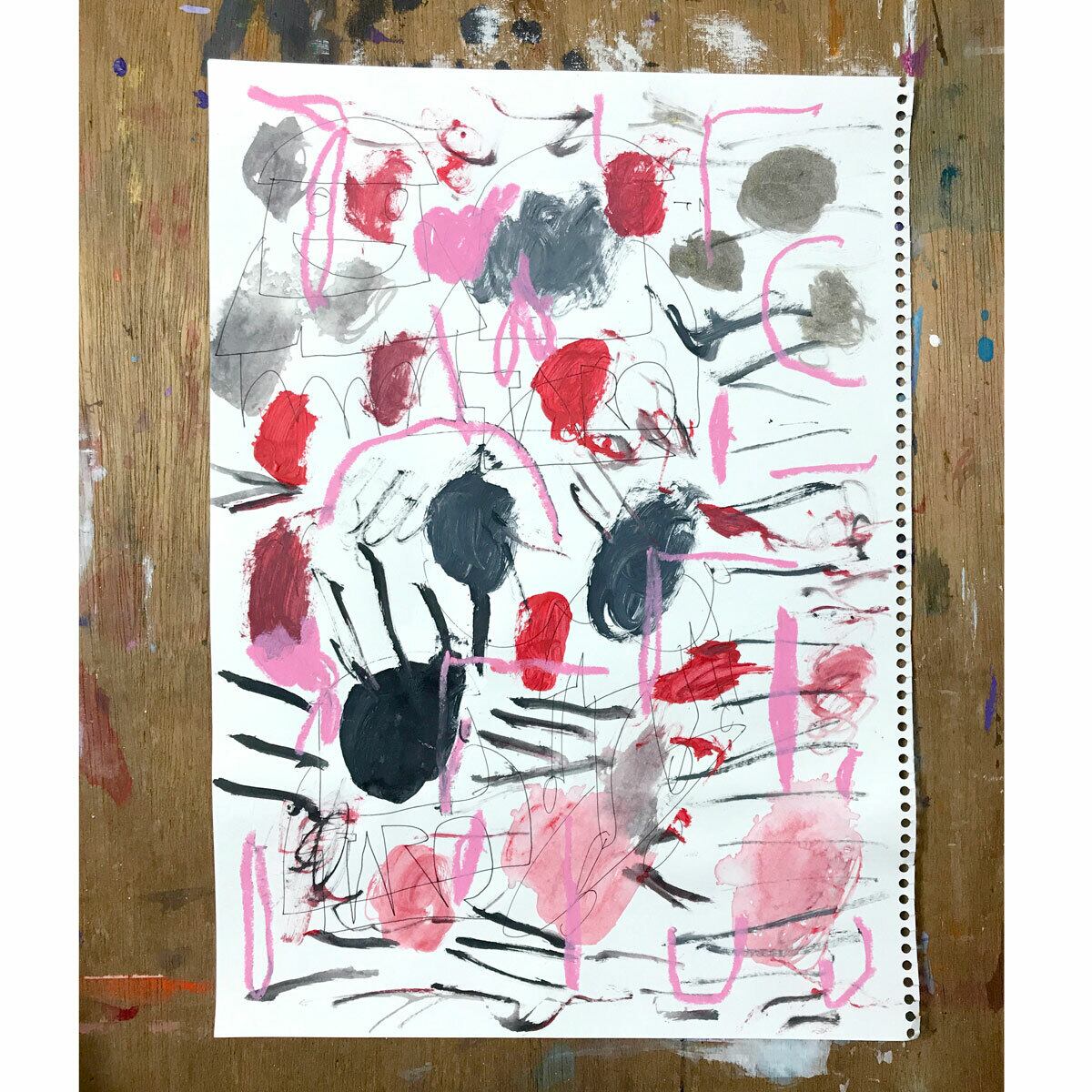 アクリル絵の具、クレヨン、ペンを使用して紙に描いています。
